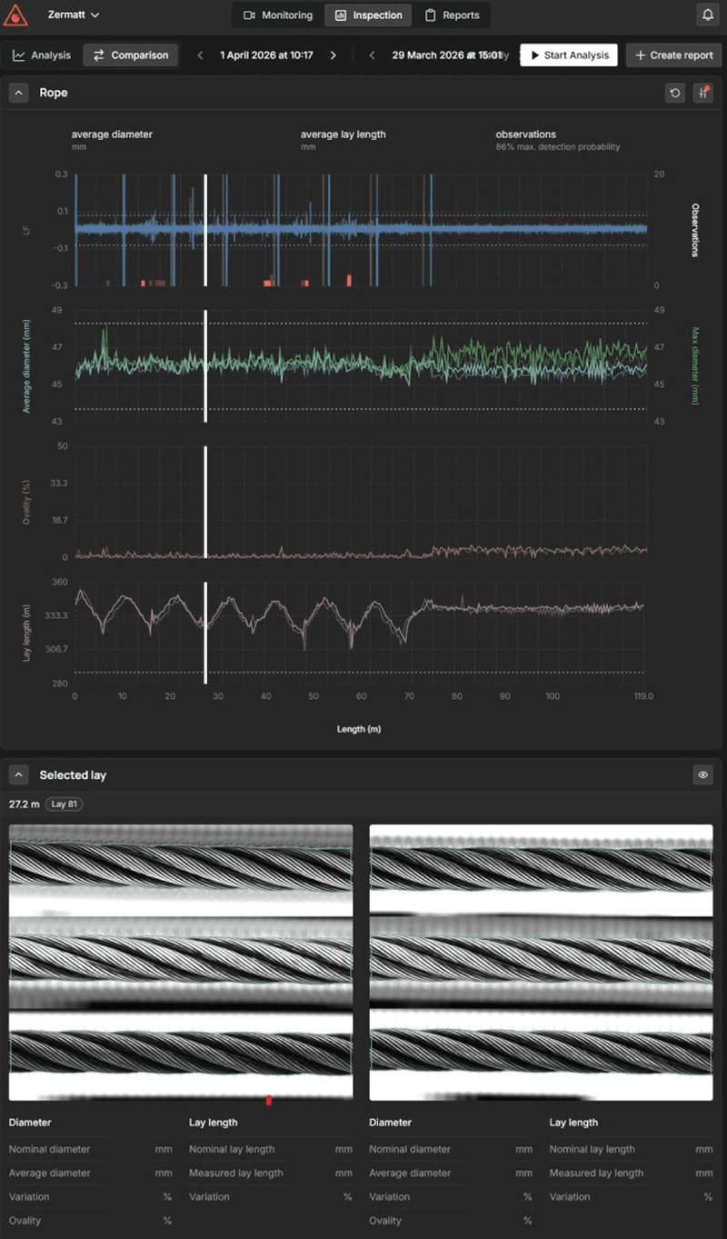 The system was installed at the middle station of a detachable chairlift operating at the nominal speed of 5 m/s and connected directly to the operator’s network. It has now been running continuously for roughly two months. The natural lighting conditions at the site are excellent, enabling very high image quality. Synchronization with the MRT system has been smooth, and the automated reporting functionality is already providing concise summaries of the rope status.